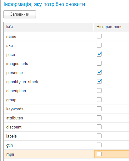 Які дані по товару оновлювати/не оновлювати ви також визначаєте в налаштуваннях: