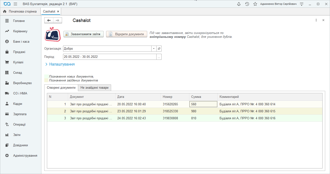 Зазвичай дані з продажу фіксуються саме в програмній касі Cashalot і для коректного ведення обліку в BAS їх доводиться переносити вручну.