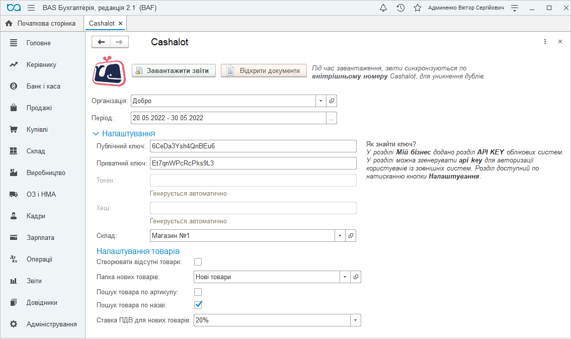 Обробка працює через API KEY облікових систем з Кабінету Cashalot. Налаштування API ключів та нових товарів відбуваються безпосередньо в BAS, в даному готовому рішенні.