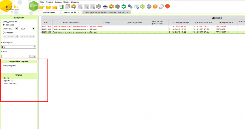 3. У таблиці Реєстру будуть відображені лише записи з документами щодо вказаної ліцензії за обраний період (Рис. 4).